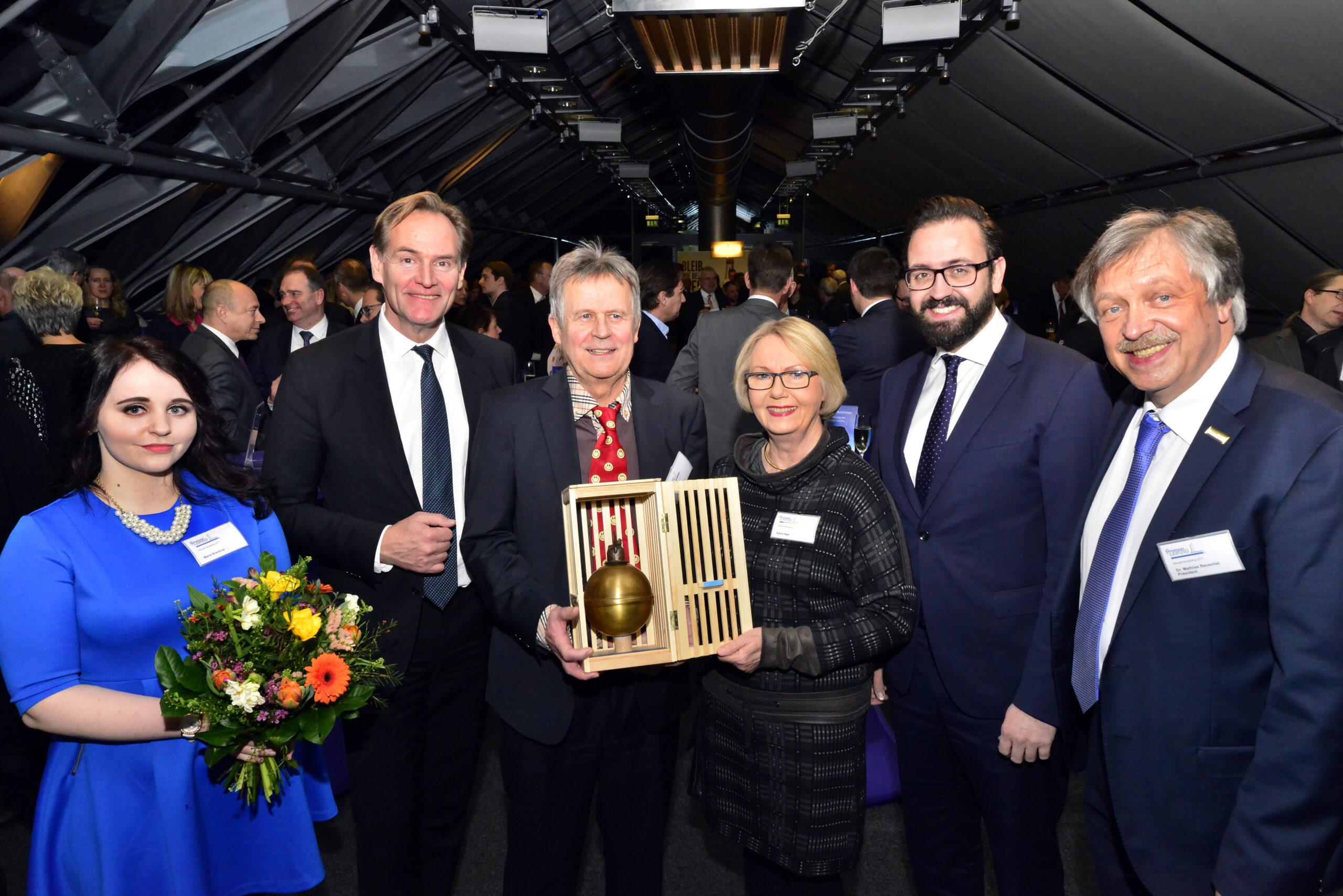 Ein großer Moment für Lachmesse-Macher Arnulf Eichhorn (3.v.l.): Beim Neujahrsempfang im Jahr 2017 des Vereins Gemeinsam für Leipzig gab es für ihn die „Golde- ne Lerche“ – in Anerkennung jener Verdienste, die er bei der Pflege des Leipziger Humor gesammelt hatte. Foto: Armin Kühne