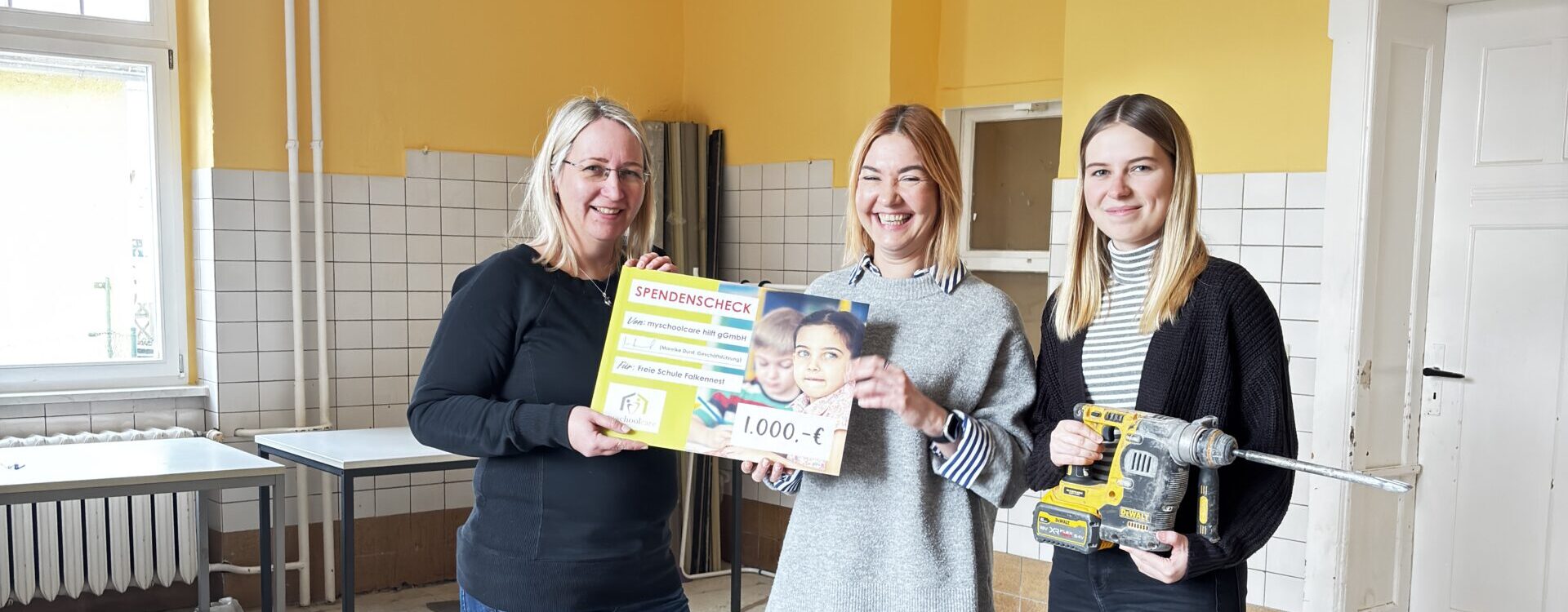 Die myschool-care hilft gGmbH hat das Crowdfunding-Projekt der Freien Grundschule Falkennest zur Sanierung ihrer Schulküche mit einer Spende in Höhe von 1000 Euro unterstützt. Dazu überreichte Anne Mittelstädt, Standortleiterin in Leipzig, am 15. Januar 2026 einen Scheck an Martina Fröhnert, Mitbegründerin und Pädagogische Leiterin der Freien Grundschule.