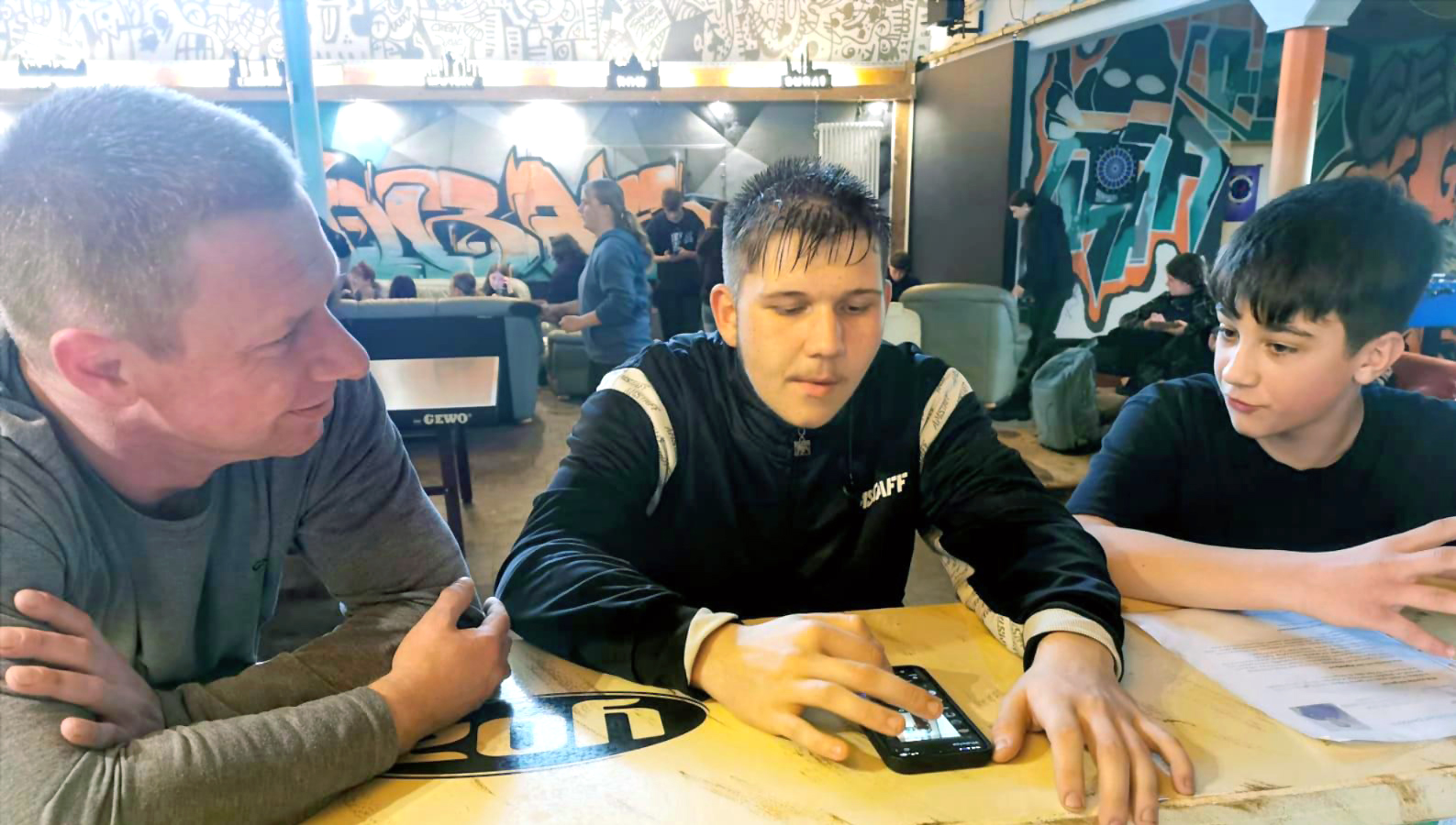 Wie an diesem warmen Freitag im März. Die Kids sind mit ihren Skateboards auf den Rampen unterwegs, feuern sich gegenseitig an, wetteifern um den größten Applaus. Andere chillen auf den Ledersesseln im Haus und zeigen sich gegenseitig die TikTok Highlights des Tages. An der Theke steht Roy Philipp und unterhält sich gerade mit zwei Jungs, die auf ihre Cola warten.