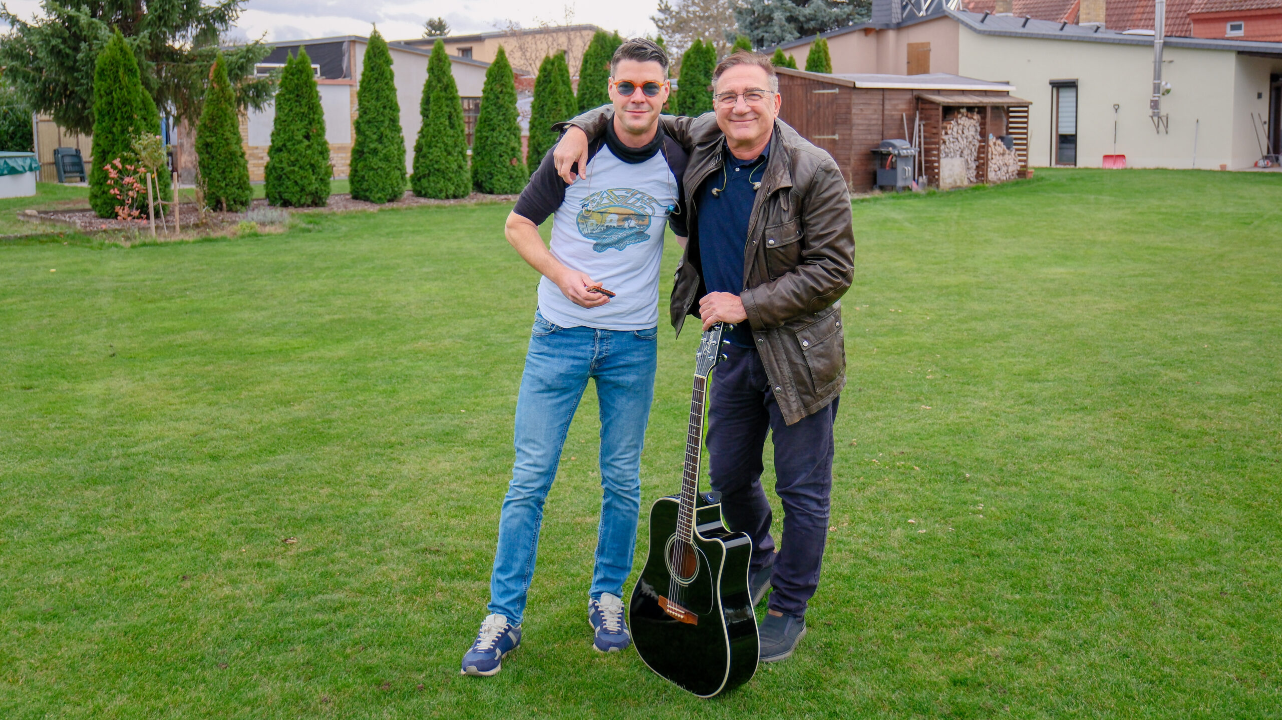 Hier lebt Sebastian Monse mit Frau und zwei kleinen Kindern. Vater Uwe wohnt nur ein paar Straßen entfernt. Praktisch fürs Proben – und für die Kinderbetreuung. Im Holzhäuschen steht das Schlagzeug, daneben ein Dutzend weiterer Instrumente. Da sie nur als Duo unterwegs sind, spielen sie Bass, zweite Gitarre oder andere Stimmen vorab selbst ein. Ursprünglich wollten Vater und Sohn ein reines Programm mit Musik des ostdeutschen Liedermachers Gerulf-Pannach gestalten. Doch dann erweiterten sie das Repertoire: Renft, City, Karat, Stoppok, Lindenberg, Westernhagen – dazu fünf Akustik-Nummern. Zwei Stunden Musik, konzentriert und handgemacht.